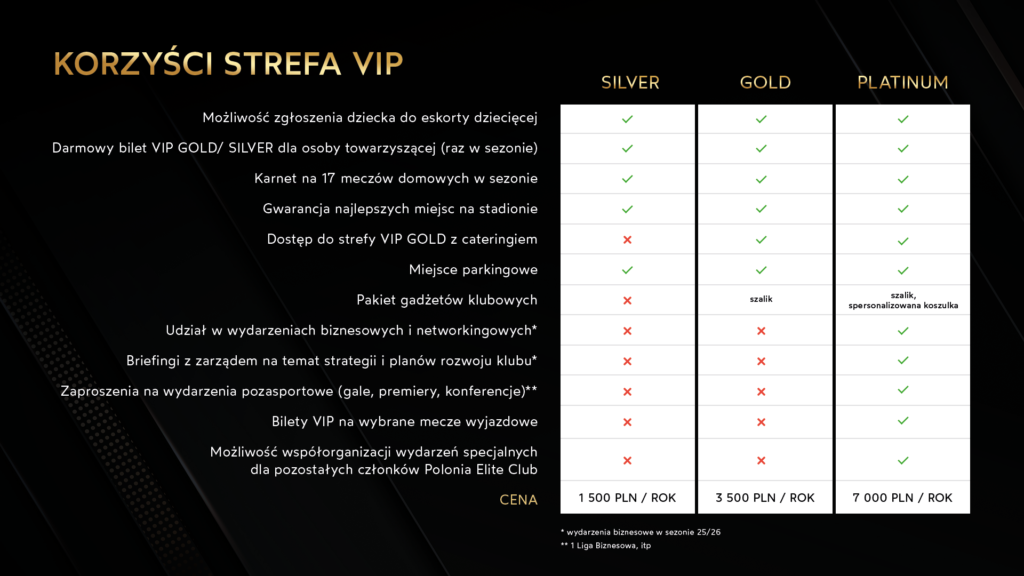 To wyjątkowa możliwość nawiązania kontaktów biznesowych i poznania inspirujących ludzi, dostęp do najlepszych miejsc na stadionie, niezapomniane przeżycia w dniu meczu oraz szansa na wspieranie jednego z najbardziej zasłużonych klubów piłkarskich w kraju.